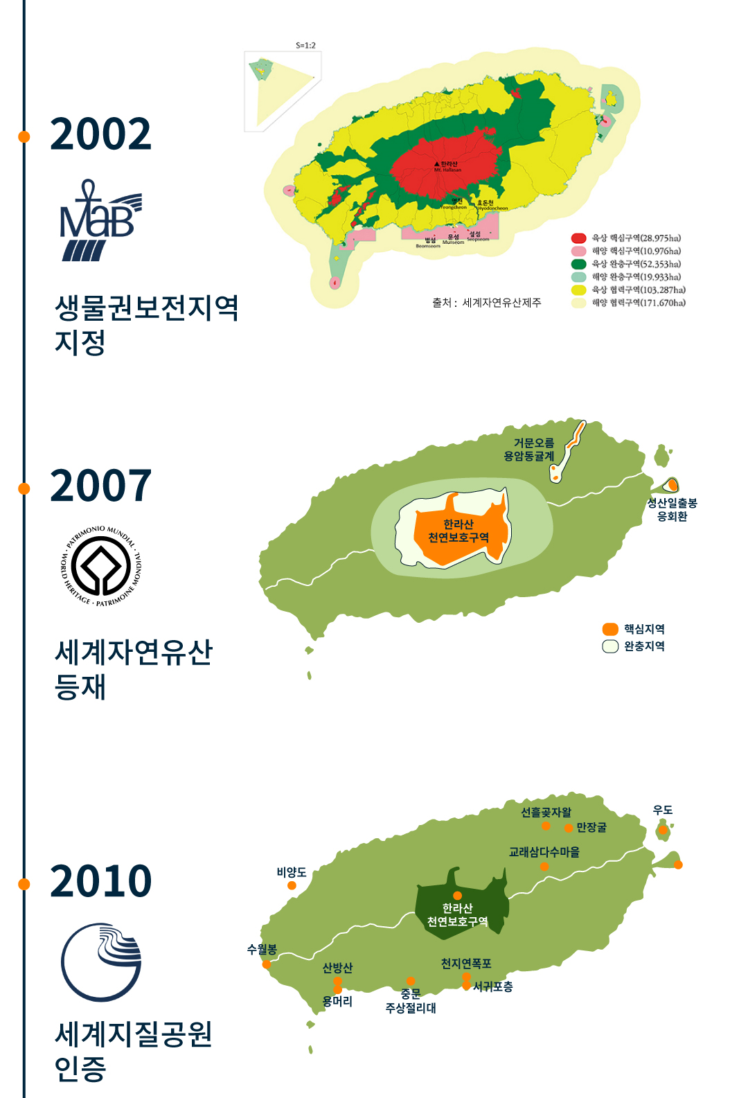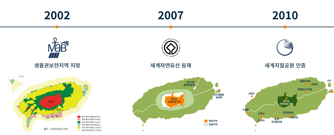 이러한 제주의 가치는 2002년 생물권보전지역 지정을 시작으로 2007년 세계자연유산 등재, 2010년 세계지질공원 인증까지 UNESCO 3관왕을 달성하였습니다. 이는 세계적으로 유례가 없는 것으로, 제주가 전 세계인이 함께 가꾸고 보전해야 할 '환경 자산의 보물섬'으로 도약한 것입니다.