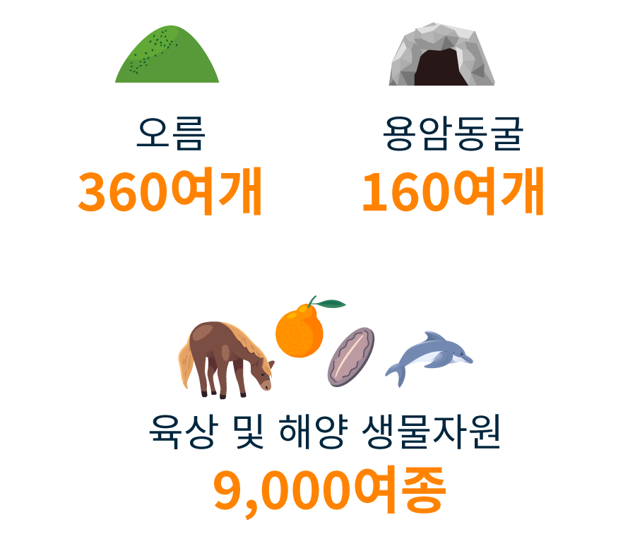 화산활동으로 만들어진 제주도는 섬 전체가 ‘화산 박물관’이라 할 만큼 다양하고 독특한 화산 지형을 자랑합니다. 땅 위에는 크고 작은 360개의 오름이 펼쳐져 있고, 땅 아래에는 160여개의 용암 동굴이 섬 전역에 흩어져 있는데, 작은 섬 하나에 이렇게 많은 오름과 동굴이 있는 경우는 세계적으로 매우 드뭅니다.