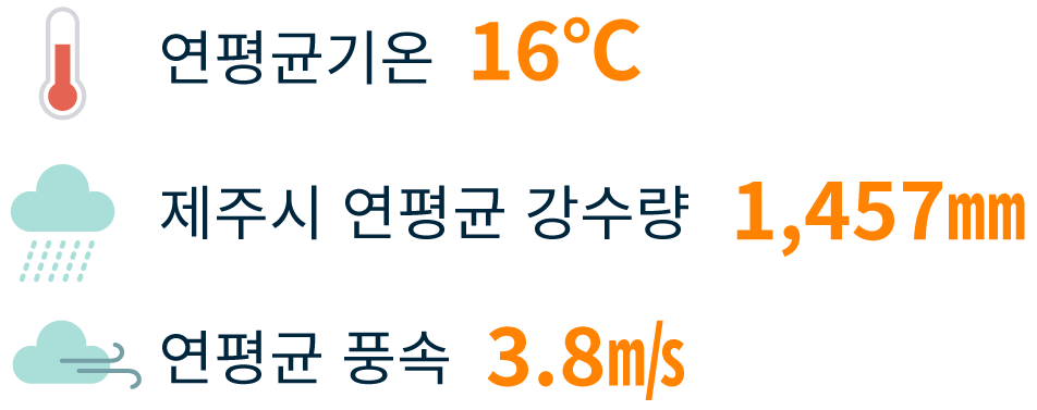 제주의 연 평균 기온은 약16℃이며, 제주시의 연평균 강수량은 1,457㎜, 서귀포시는 1,850㎜, 연 강수량은 1,000㎜~1,800㎜ 정도로 우리나라 최대 다우지입니다. 또한 제주는 예로부터 풍다(風多) 지역으로 유명합니다. 연중 바람 부는 날의 빈도가 많을 뿐만 아니라 강풍의 빈도 또한 많습니다.